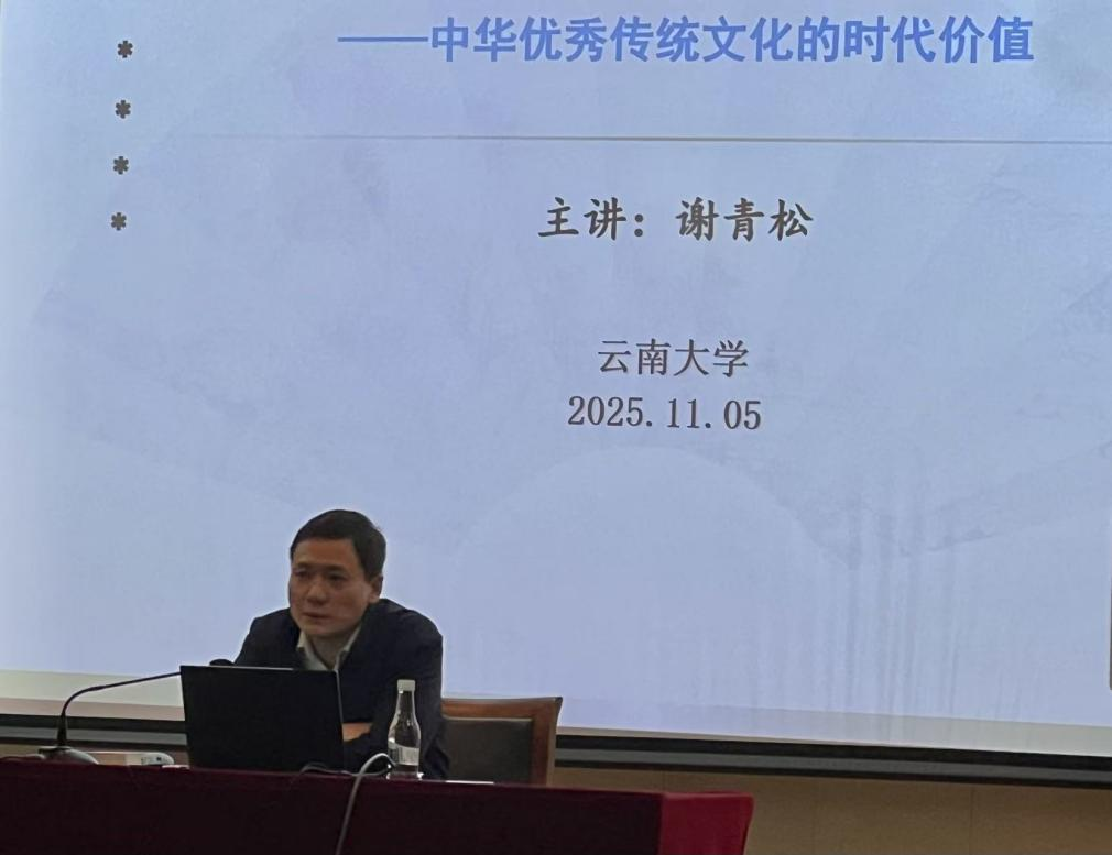 讲座中,云南大学文学院研究员、博士生导师、云南省国学研究会会长谢青松教授围绕中华优秀传统文化的时代价值层层递进,深入阐释理解、阐释与传播优秀传统文化对增强文化定力与自信的核心意义。他通过什么是经典?如何读经典?并结合儒道思想互补特性,从“进退自如、修己安人、穷通皆乐”三方面,探讨传统文化对个人生命品质、价值观的滋养及跨文化沟通中的独特作用。整场讲座紧扣学院培养国际中文教师、传播中华文化的核心使命,为师生呈现了一场兼具思想深度与实践意义的文化盛宴。