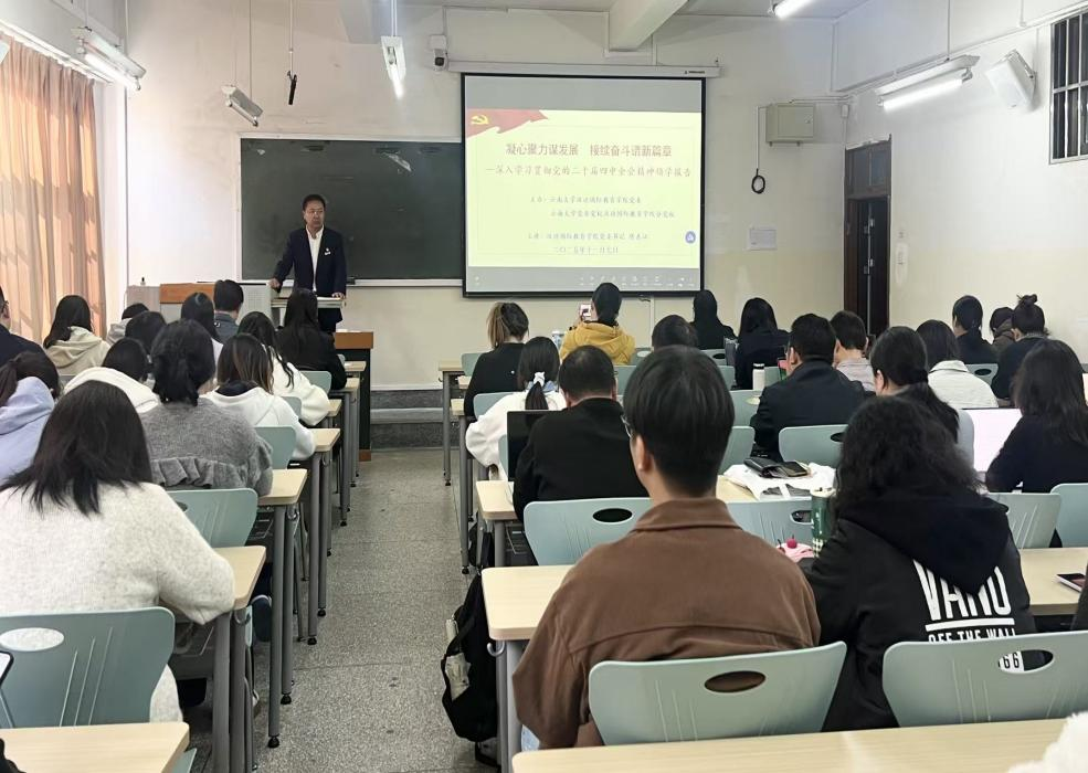 2025年11月7日,云南大学汉语国际教育学院党委、分党校召开党的二十届四中全会精神专题学习会。学院党委书记陈善江以《凝心聚力谋发展 接续奋斗谱新篇》为题作领学报告,传达学习贯彻党的二十届四中全会精神,学院师生党员及入党积极分子参会学习。