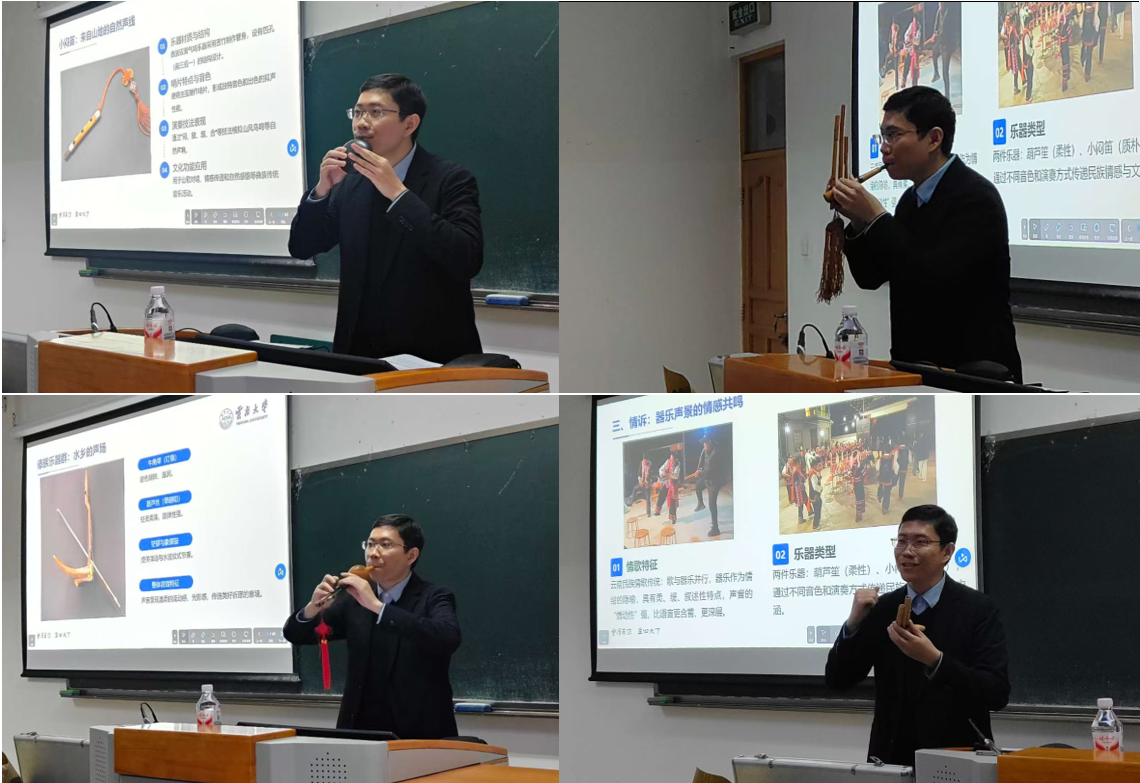 本次活动特邀云南大学艺术与设计学院邱健副教授担任主讲。讲座以其作为主要策划和导聆,于今年5月在中国音乐学院“2025中国当代音乐创作(北京)学术研讨会暨中青年作曲家交流会”上演出的同名音乐会为蓝本,通过“云岭、山澜、情诉、弦醉、云舞”五大篇章,将哈尼、景颇、彝、拉祜、傣等少数民族的传统器乐“搬进”校园。邱健老师以深入浅出的讲解,结合云南省知名演奏家的演出影像欣赏及现场示范演奏,生动展示了俄芘、吐良、小闷笛、葫芦笙、四弦、玎琴等云南少数民族独有乐器的独特音色与文化内涵;阐释了这些乐器如何从云南丰饶的自然风物资源、多元的生活仪式中孕育而生,通过艺术家改良创作,重新在当代舞台中焕发新的生命力。