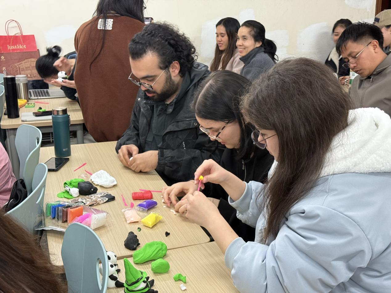 在体验过程中,同学们自由分组协作,中国学生与留学生互帮互助:留学生在作品中融入本土文化元素,中国学生则协助外国同学调试色彩、完善细节,现场充满了欢声笑语。