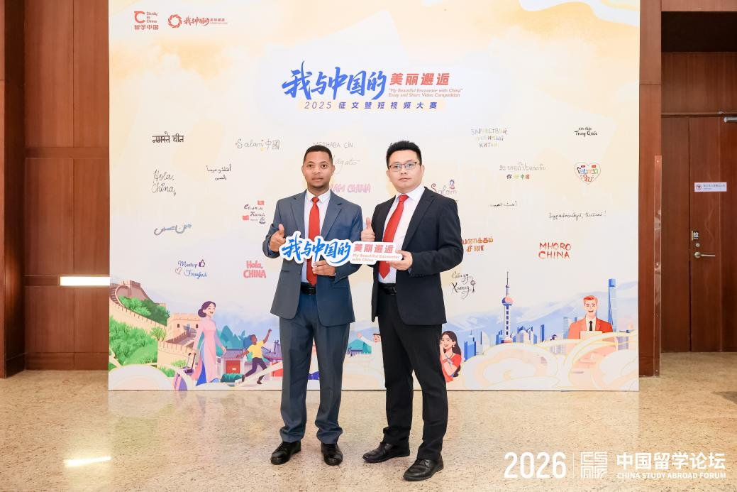 2026年4月10日,青年教师程涛和卢旺达籍参赛选手马伟在国家会议中心参加2025“我与中国的美丽邂逅”征文暨短视频大赛颁奖仪式。