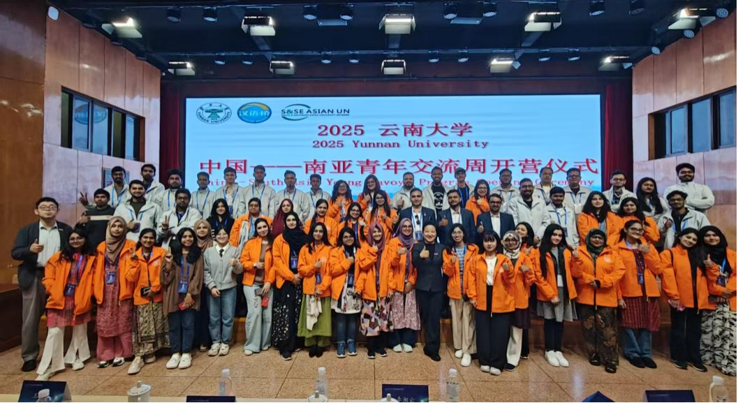 2025年10月21日上午,由教育部中外语言交流合作中心、云南省教育厅主办,云南大学承办的2025年中国——南亚青年交流周暨“汉语桥”孟加拉国青年访华交流营在云南大学科学馆一楼报告厅举行开营仪式。来自孟加拉国、巴基斯坦、印度、尼泊尔等国多个高校的60余名青年学生参加活动。